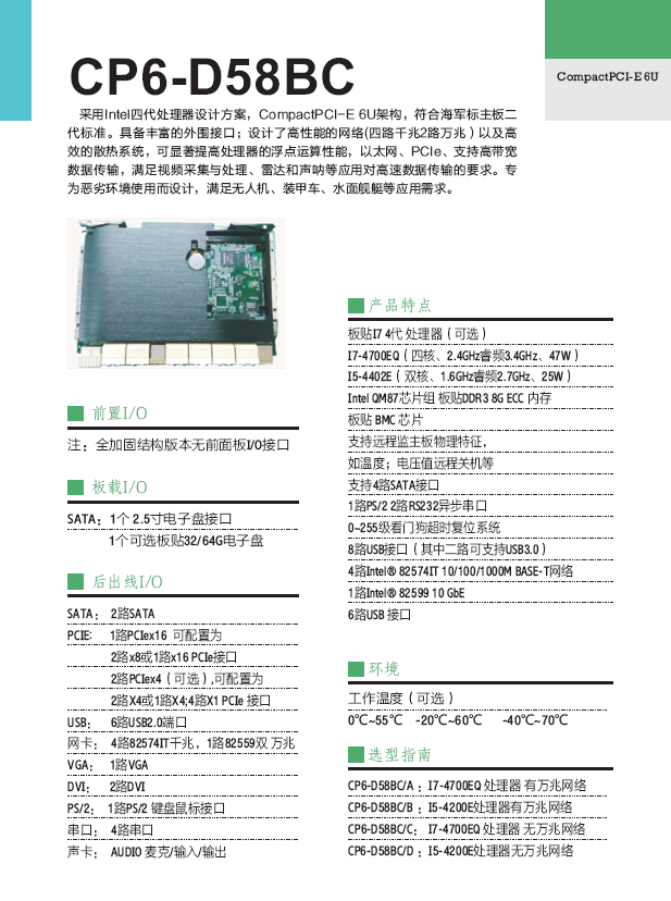采用Intel四代處理器設計方案,CompactPCI-E 6U架構,符合海軍標主板二代標準。具備豐富的外圍接口;設計了